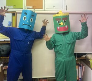 心の中にいる鬼を退治しよう!と自分で作った鬼のお面をかぶり、豆まきを楽しみました♪