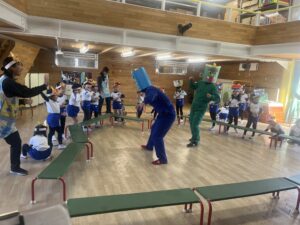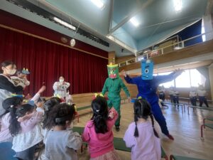 みんなで「鬼はそと!」と大きな声で豆を投げたおかげで、鬼は降参!外へ逃げていきました!